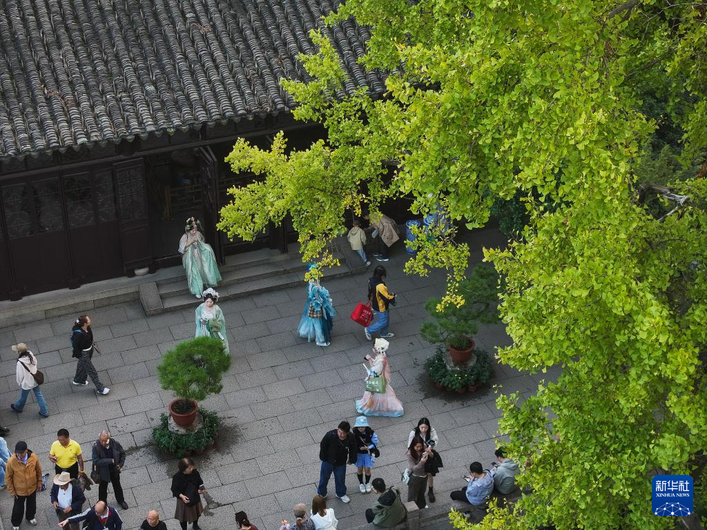 身着古装的游客在留园参观游览(10月23日摄,无人机照片)。