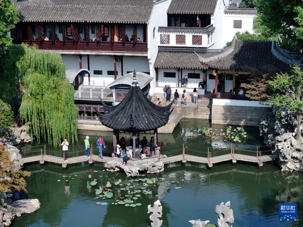 游人在苏州园林西溪环翠游览(10月23日摄,无人机照片)。