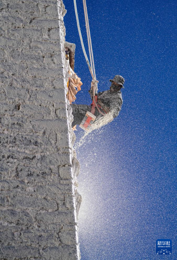 10月30日,布达拉宫管理处的工作人员在喷洒涂料。