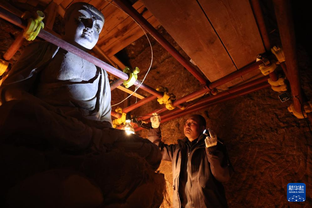 麦积山石窟艺术研究所保护研究室文物修复师牟常有(右)和何举在麦积山石窟133窟内修复塑像(11月2日摄)。