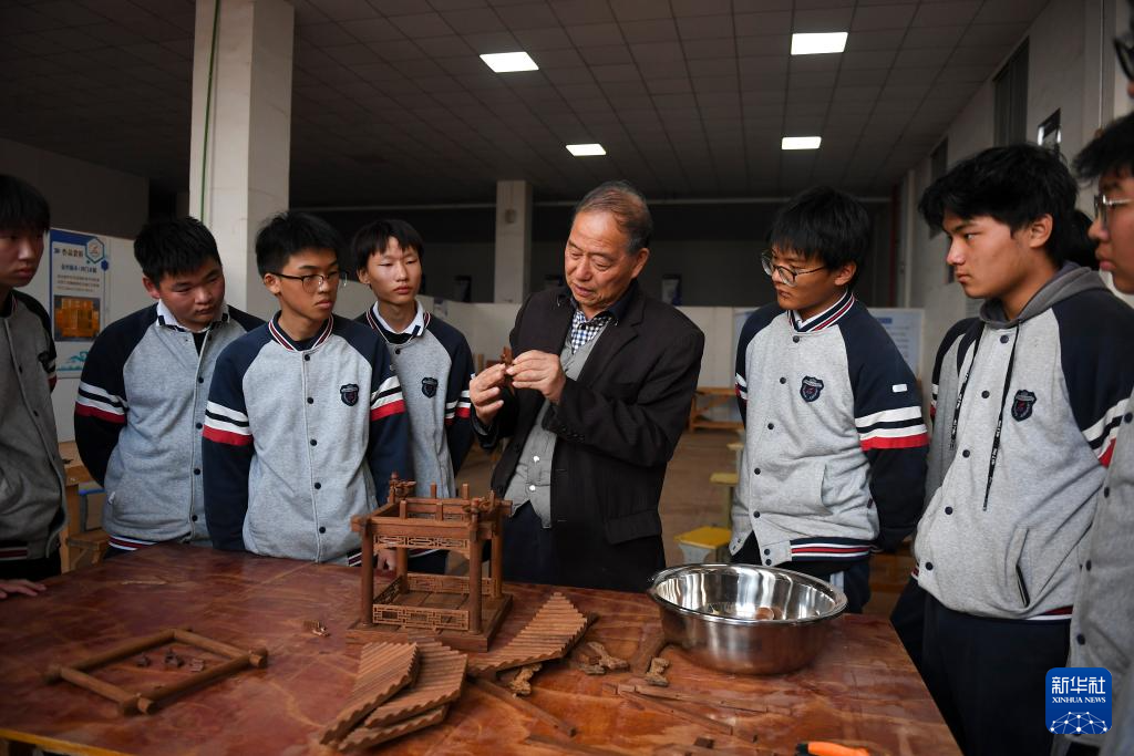 11月22日,在临海市海商职业技术学校,黄大树(中)为学生进行凉亭拼装演示。