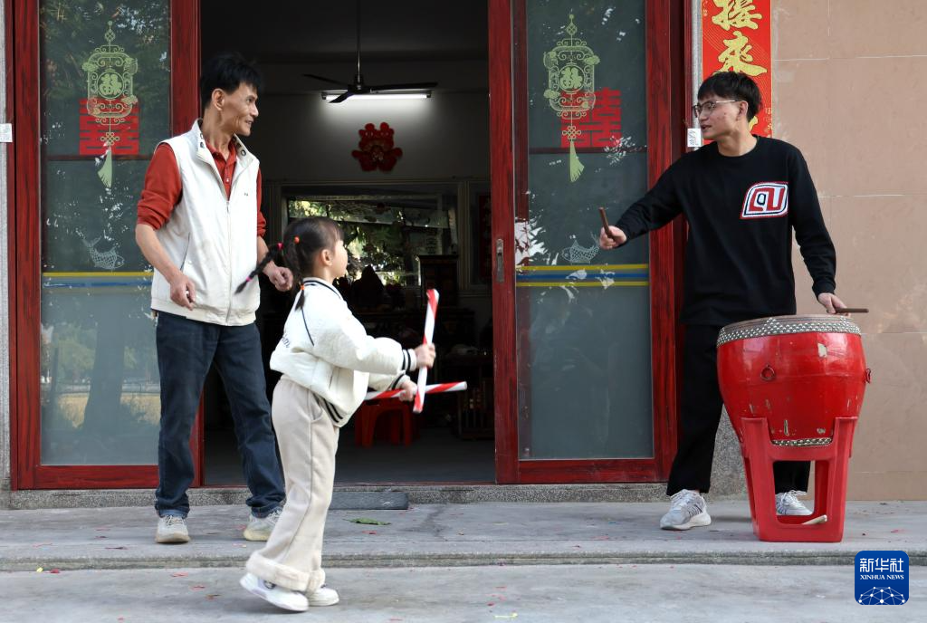 12月9日,庄恩琪在爷爷和爸爸指导下跳英歌。
