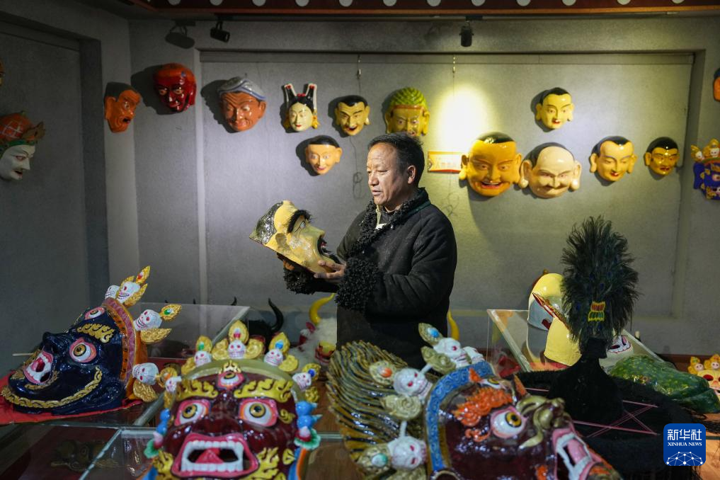12月9日,西洛在合作社展览厅查看和同事们一起制作的西藏传统面具。
