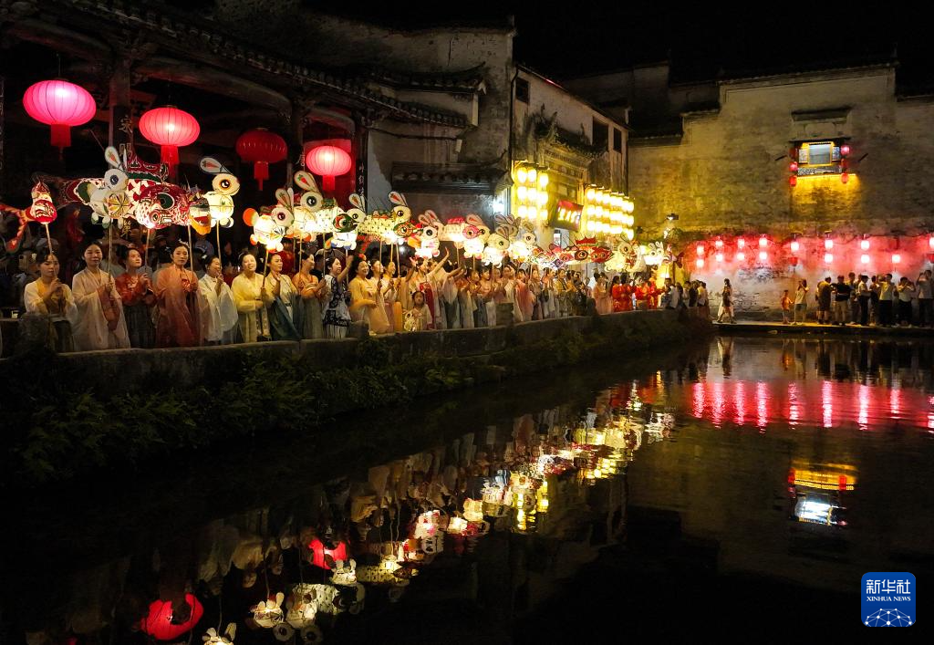 9月15日,花灯表演队伍在安徽省黄山市黟县宏村巡游(无人机照片)。