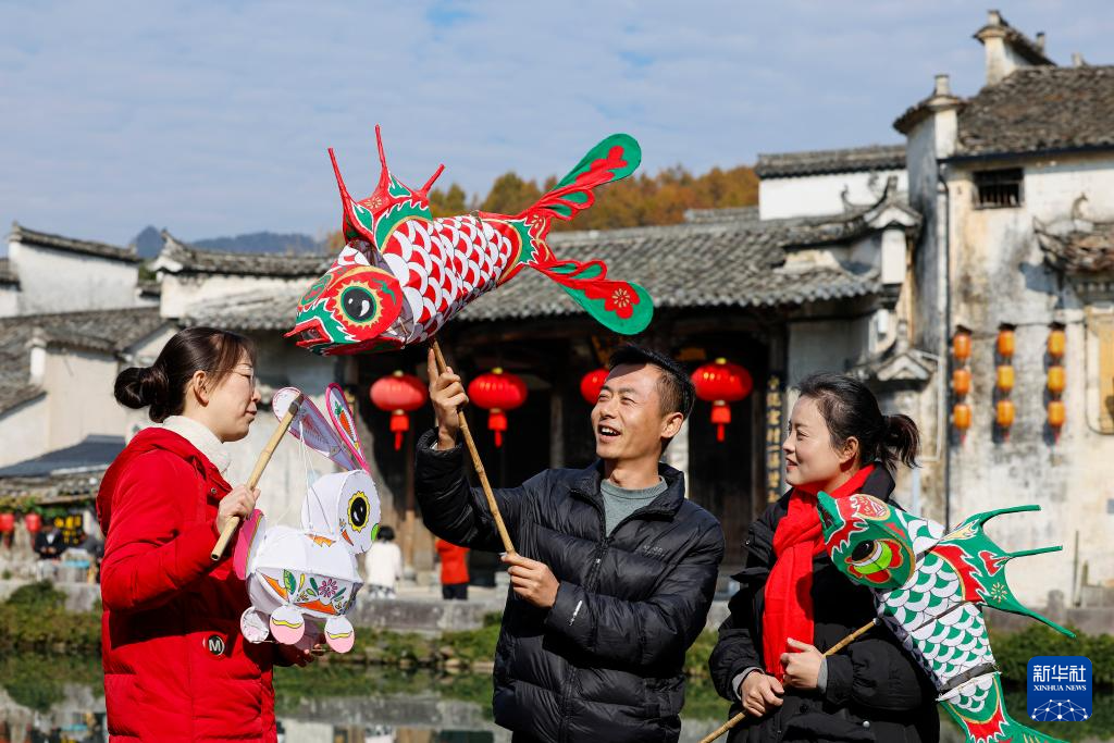 12月9日,在安徽省黄山市黟县宏村,何继星(中)和学员在查看花灯。