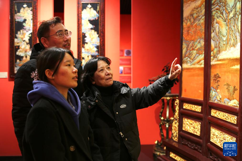 胡昕在工作室内创作金漆镶嵌作品(12月10日摄)。
