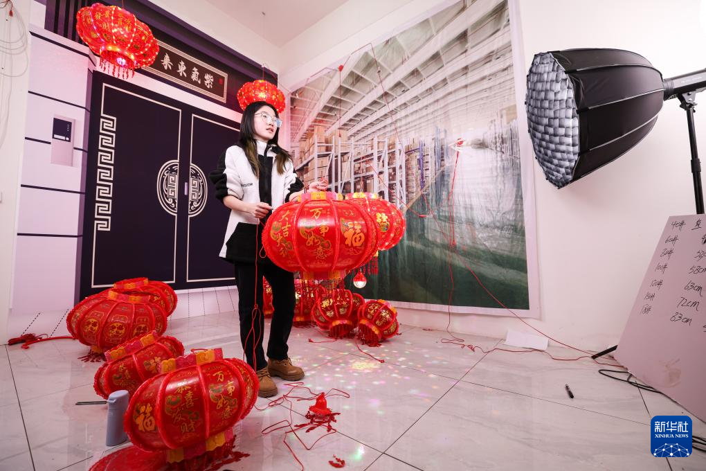 12月16日,在河北省石家庄市藁城区梅花镇屯头村宫灯直播基地,工作人员通过直播方式销售宫灯。