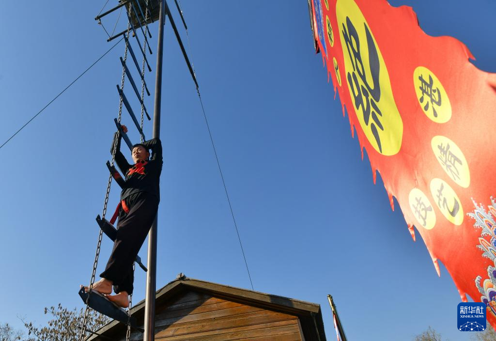 12月17日,杂技艺人在河北吴桥杂技大世界江湖文化城表演《上刀山》。