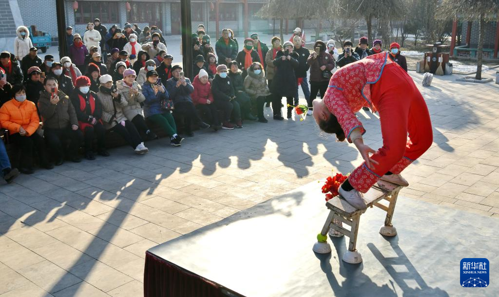 12月17日,杂技艺人在河北吴桥杂技大世界江湖文化城表演柔术。