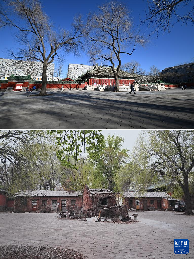 拼版照片:上图为腾退修缮后的庆成宫正殿西侧区域;下图为翻拍的庆成宫正殿西侧区域腾退修缮前的资料照片(12月21日摄)。