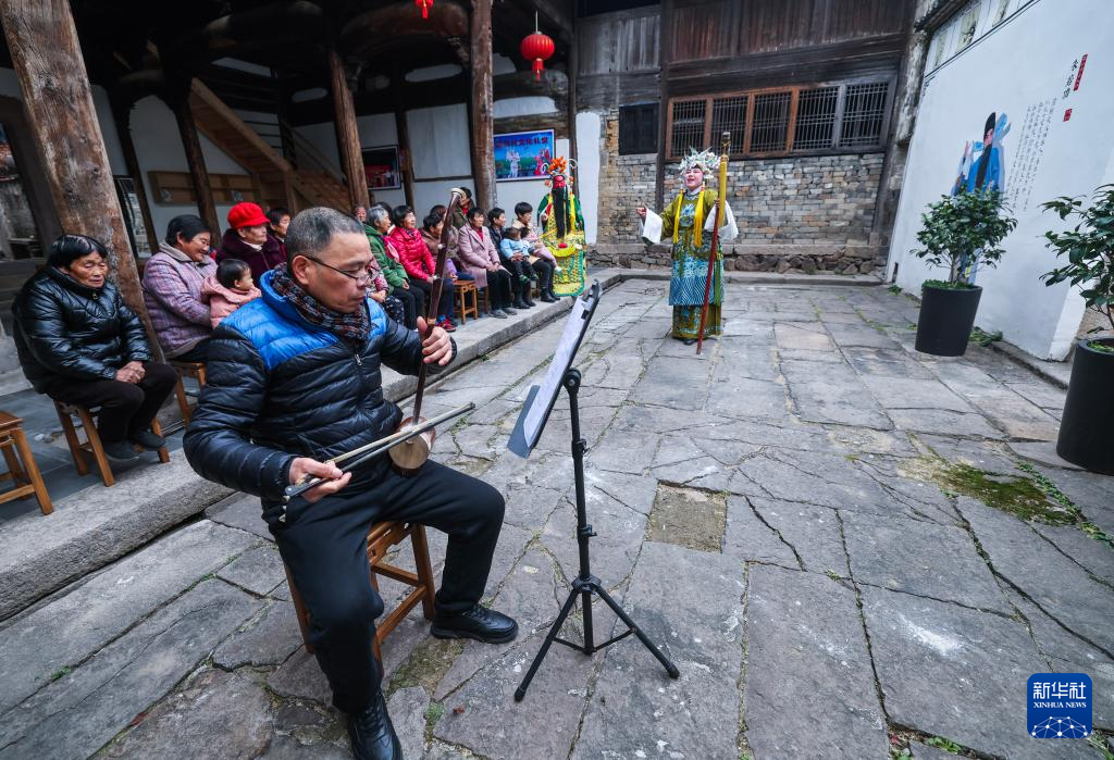 12月25日,郑店村婺剧坐唱班的演员在村文化礼堂为村民们演出婺剧《杨八姐游春》。