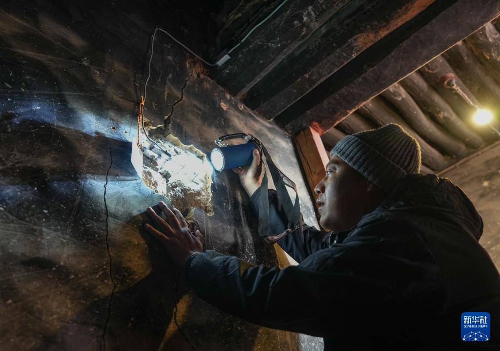 12月4日,布达拉宫监测中心的工作人员旦增旺堆巡查布达拉宫木结构传感器设备。