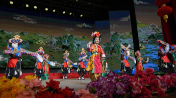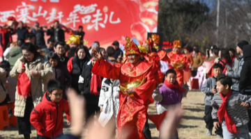 12月29日,非遗巡游队伍在妙西镇龙山村与村民和游客互动。