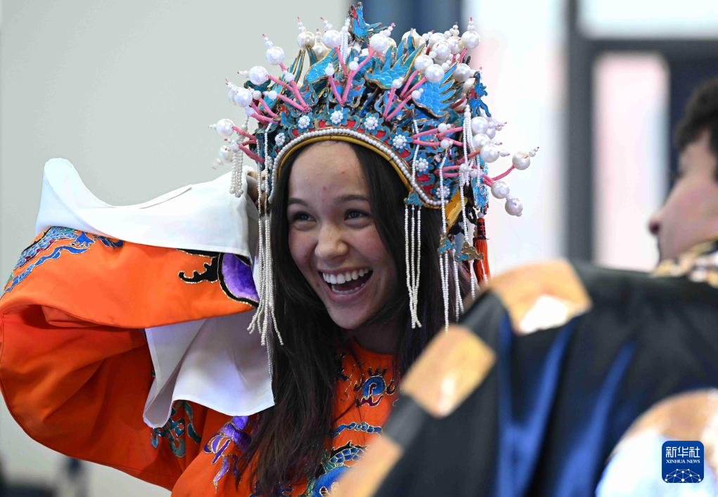 12月30日,美国大学生在河北省石家庄市京剧团体验。