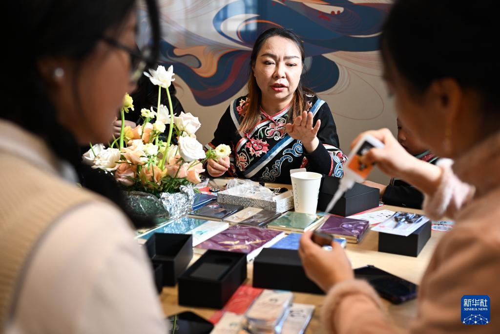 1月10日,彝族刺绣传承人樊志勇(中)在店内指导体验者制作手工艺品。