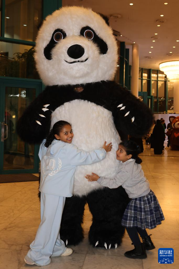 1月11日,在沙特阿拉伯首都利雅得文化宫举行的“新春大集”活动上,孩子们与大熊猫人偶合影互动。
