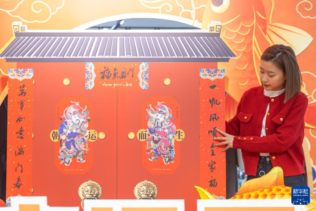 1月15日,在重庆市梁平区一商场,商场工作人员在摆放带有梁平木版年画元素的新春装饰。