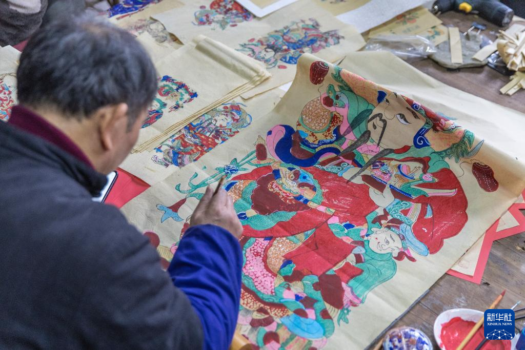 1月14日,在重庆市梁平区屏锦镇,梁平木版年画国家级代表性传承人徐家辉在工作室内为年画描色。