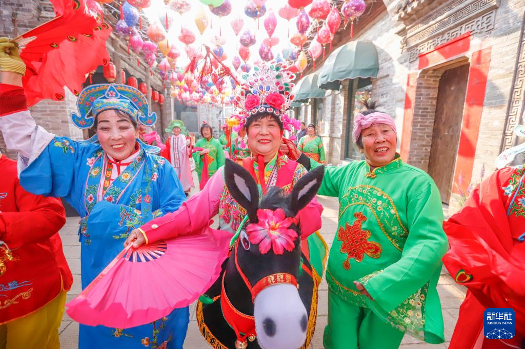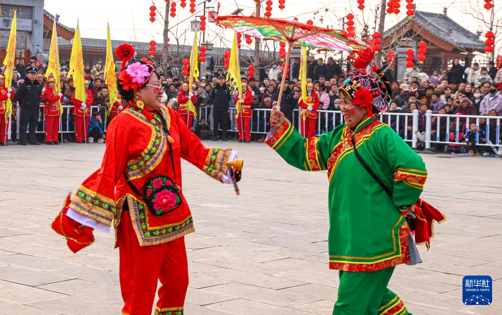 1月23日,民间艺人在河北省遵化市团瓢庄镇山里各庄村的集市上表演民俗节目。