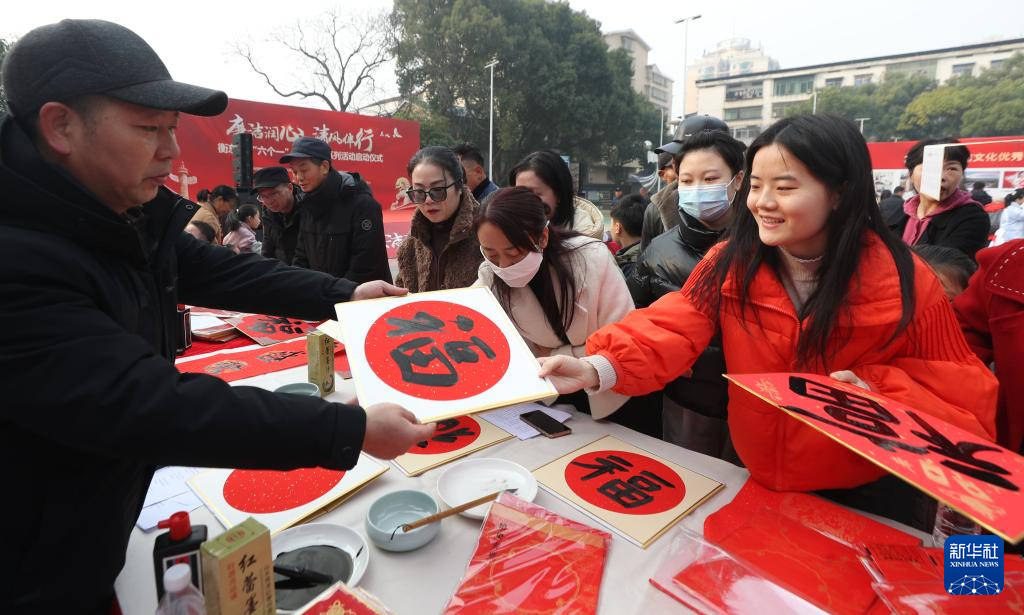 1月23日,在湖南省衡阳市衡东县文体广场,书法爱好者为群众书写对联、福字。