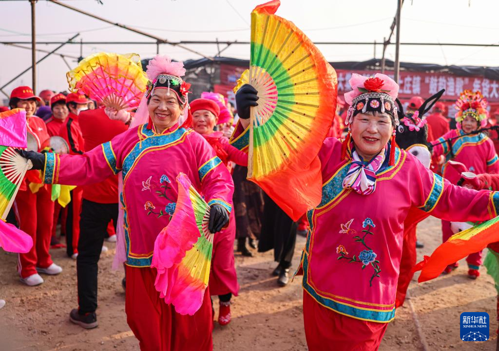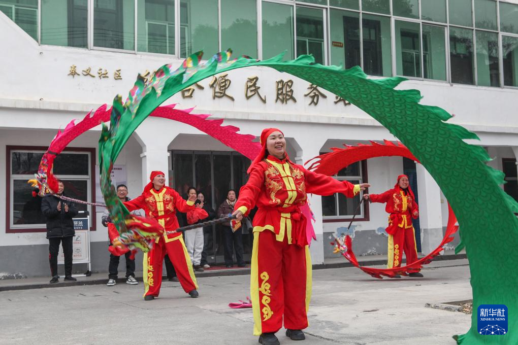 1月23日,在河南省焦作市博爱县柏山镇奉义社区,博爱空竹舞龙艺术团的艺人们为群众表演节目。
