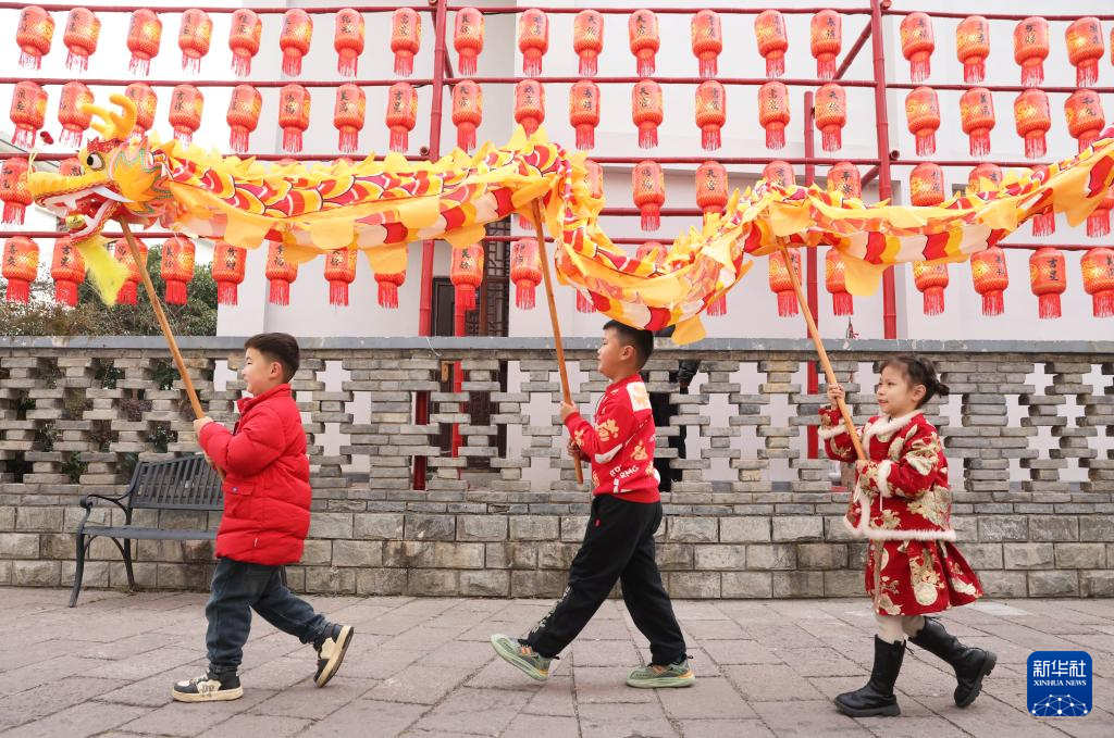 1月23日,在浙江省湖州市德清县乾元镇谈家弄,德清县中心幼儿园小朋友在舞龙。