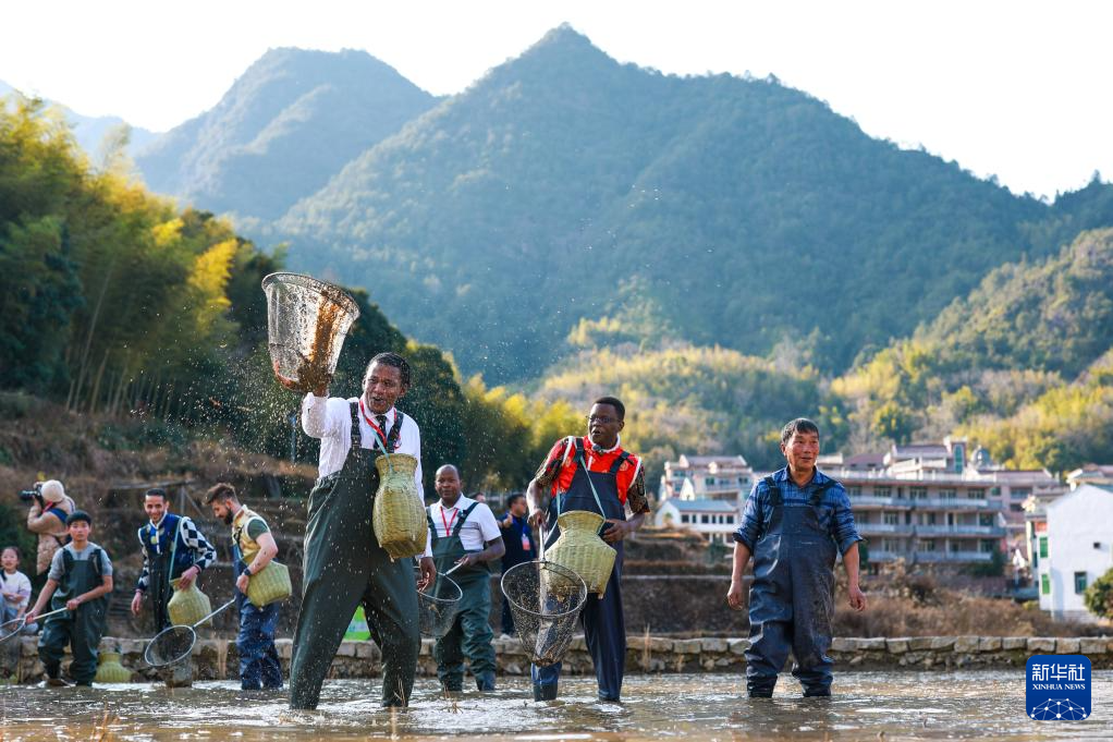 1月23日,在浙江省丽水市青田县方山乡举行的2025浙江侨乡中国年活动上,外国友人在稻田内体验捕捞田鱼。