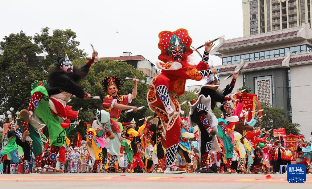 2月2日,英歌队在广东汕头潮阳区“中华英歌 舞动潮阳——2025年春节潮阳英歌嘉年华活动”中表演。