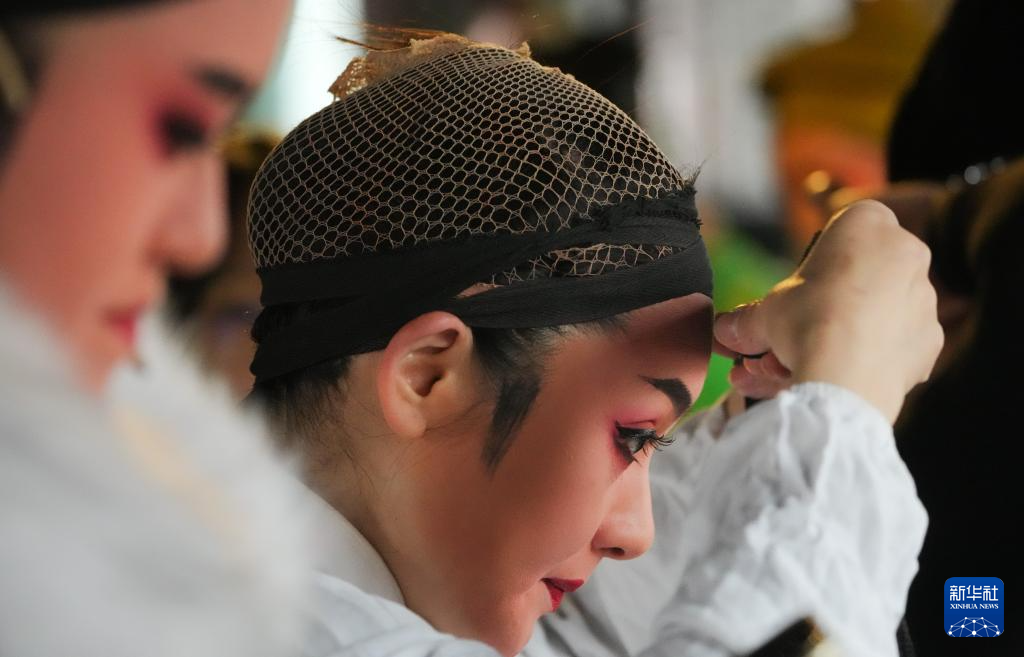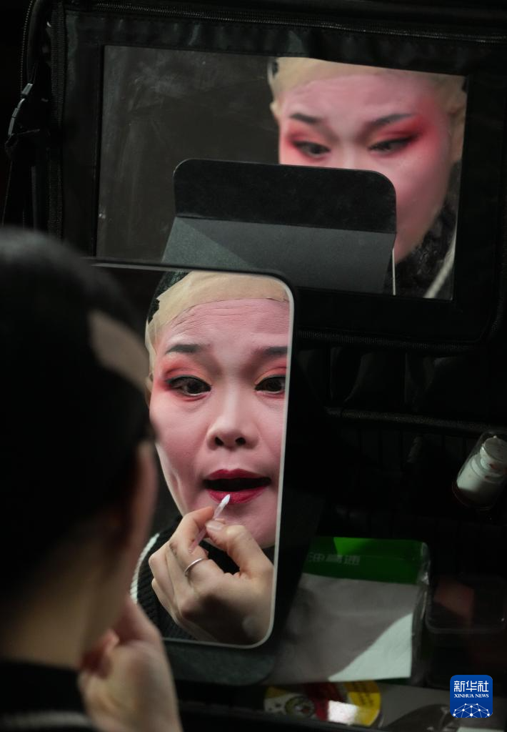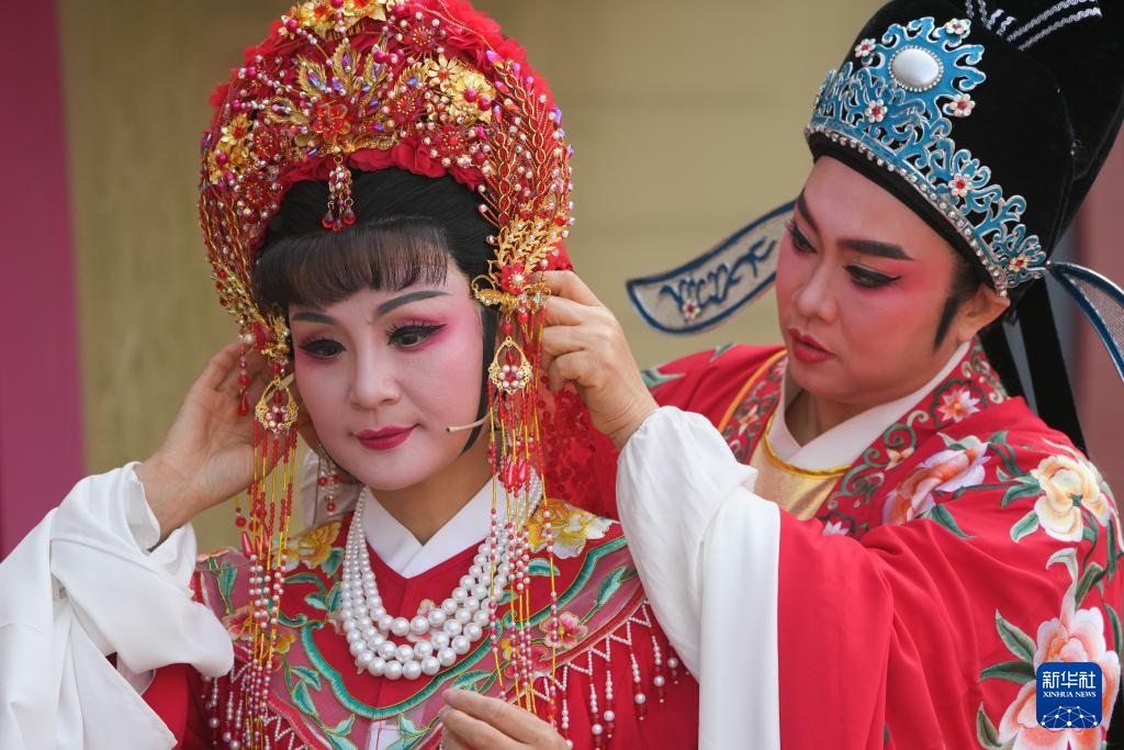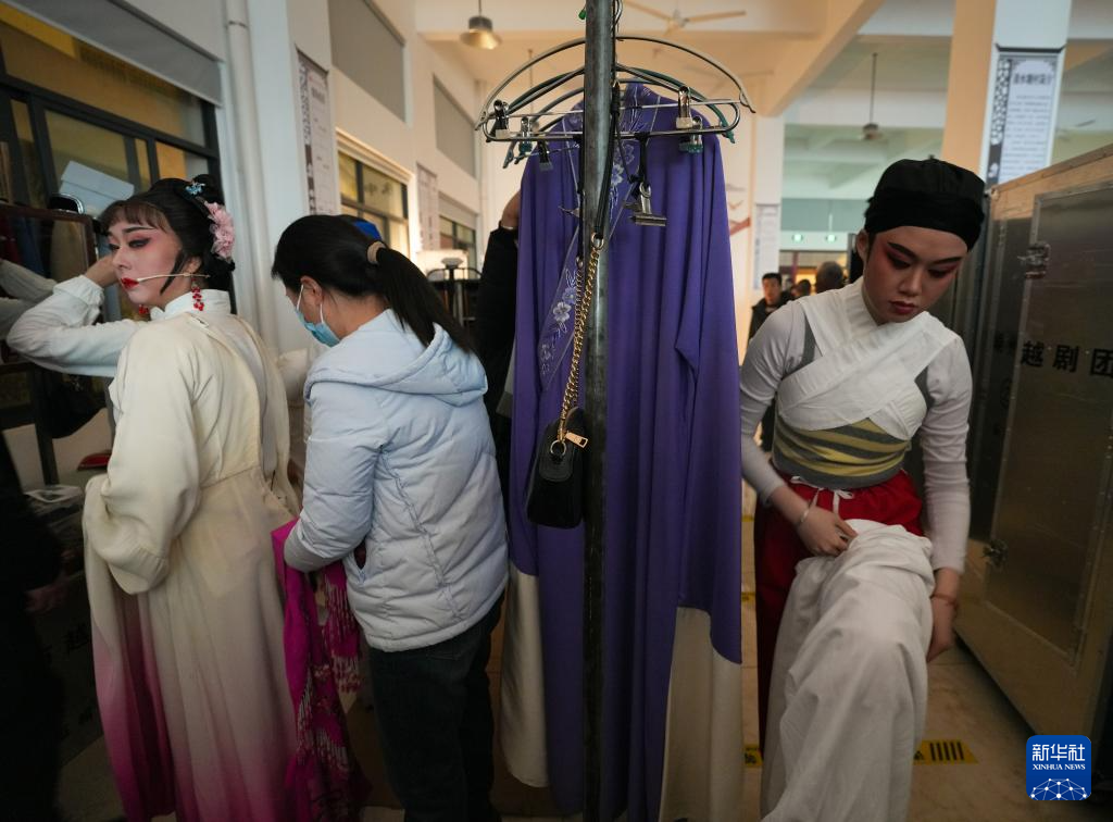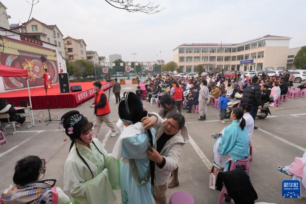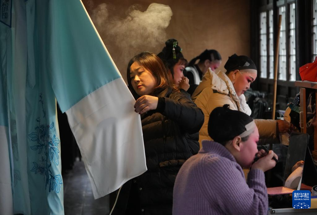在绍兴市柯桥区夏履镇莲增村,民间越剧团晶蕾艺术团成员在为表演越剧《五女拜寿》做准备(1月25日摄)。