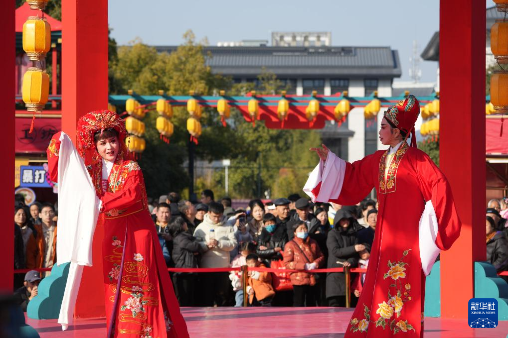 在绍兴市越城区,演员在“绍兴古城过大年”活动上表演越剧《何文秀》选段(1月29日摄)。