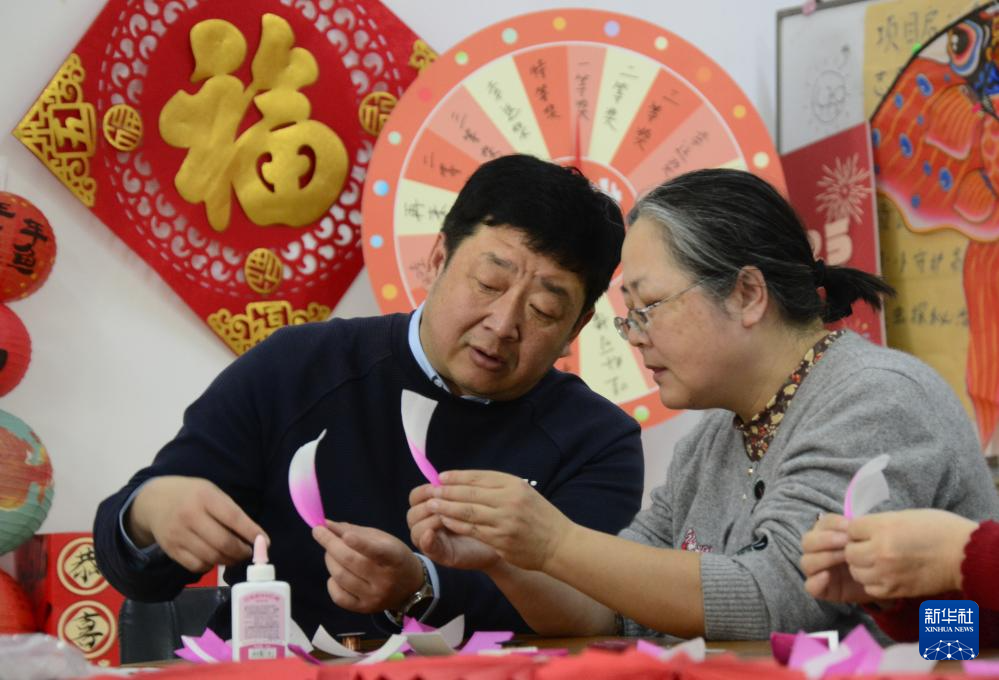 2月10日,马海捷(右三)在朝阳区安贞街道残疾人职康站指导残疾人朋友和工作人员学习制作灯彩。