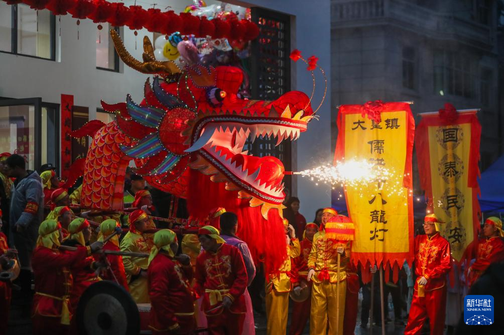 2月15日,大墅镇儒洪村村民们举行“赶十八”舞龙表演。