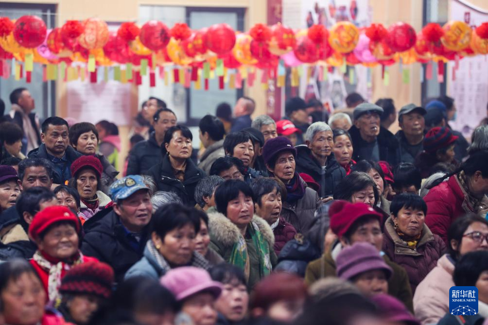 2月15日,大墅镇儒洪村村民们在文化礼堂观看传统戏曲表演。