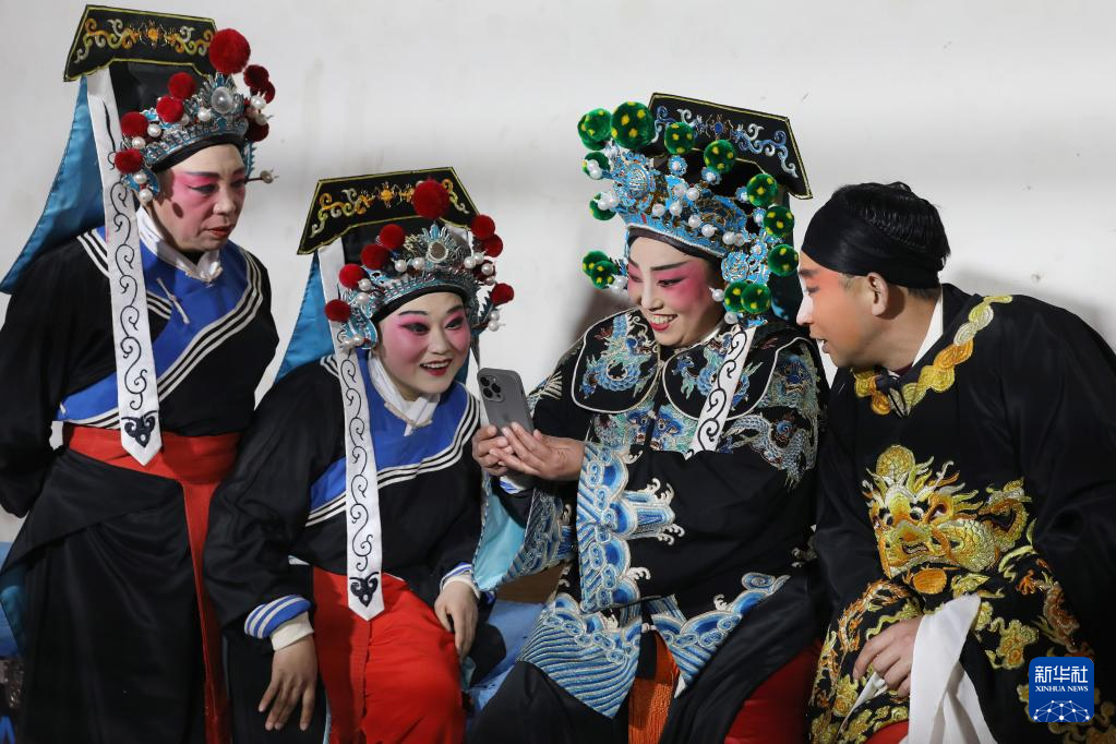 2月18日,演员在温县武德镇村文化中心候场时欣赏剧照。