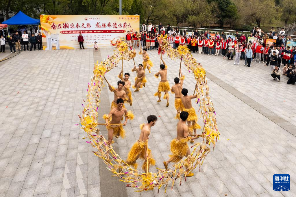 2月27日,湖南农业大学的学生在校内进行舞龙表演。