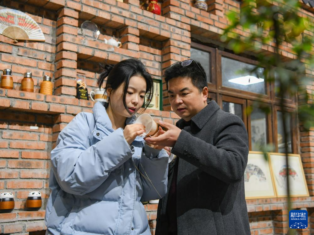 在崇州市朱利原乡非遗文化园,白静波和女儿白梓忆在查看编制中的“熊猫抱竹”盖碗茶杯细节(3月7日摄)。
