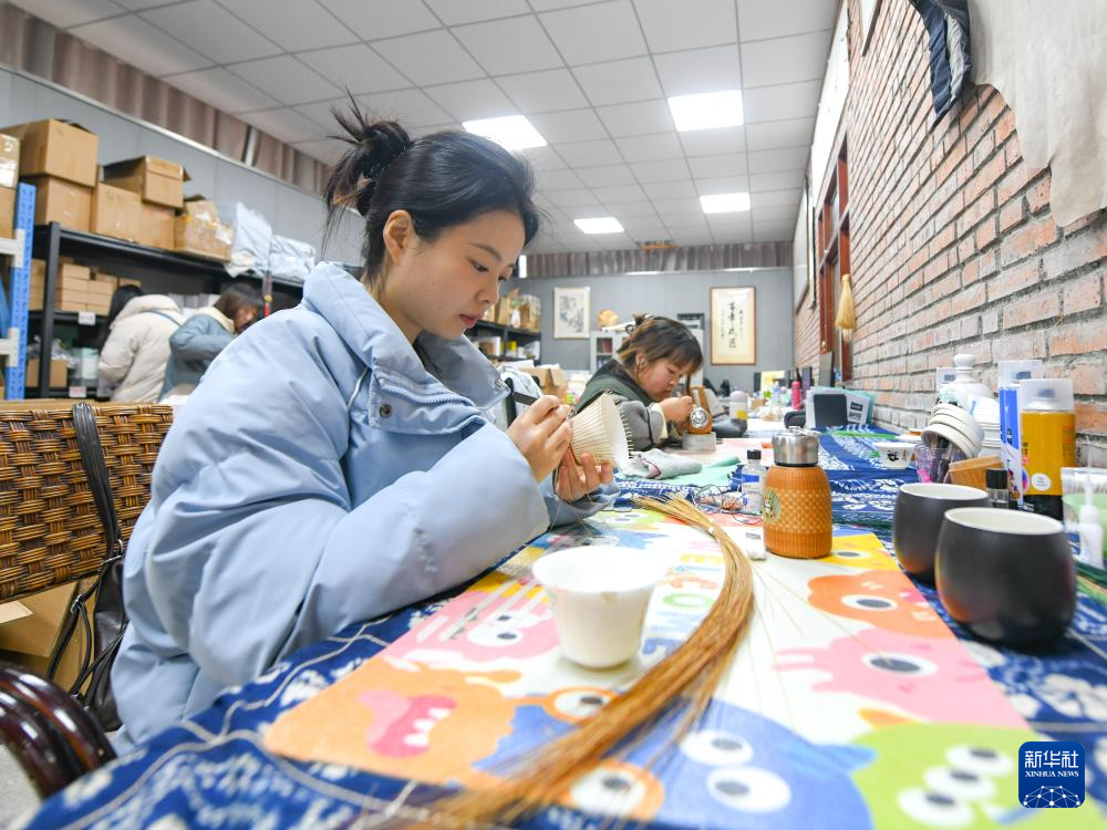 白梓忆在编制“熊猫抱竹”盖碗茶杯(3月7日摄)。