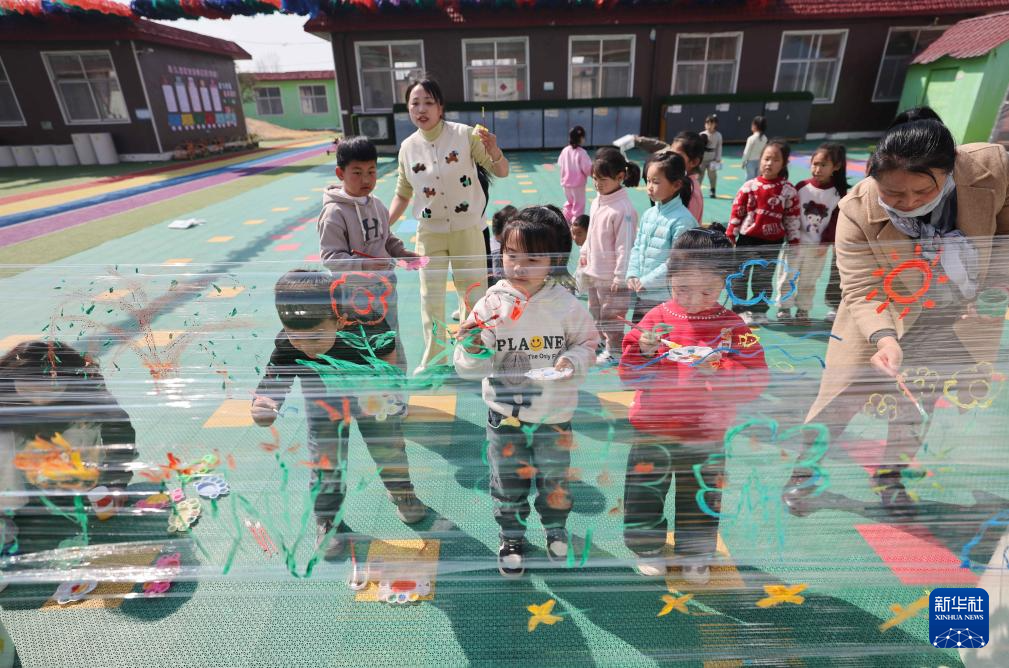 3月20日,在山东省临沂市沂南县湖头镇中心幼儿园,小朋友在老师的带领下描绘春天。