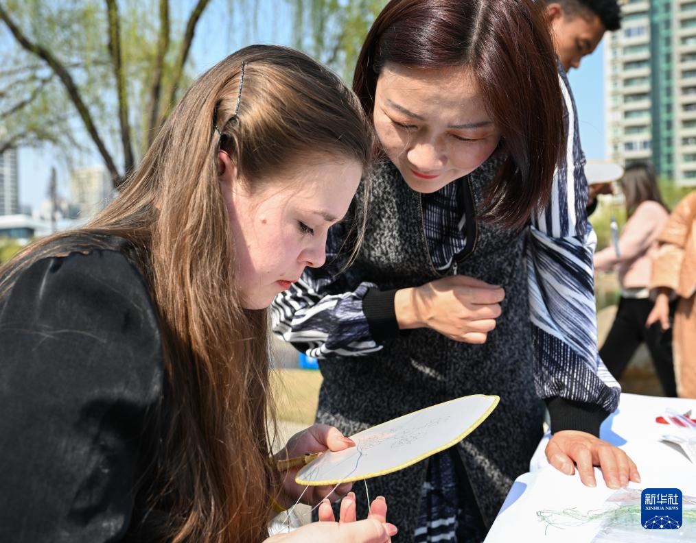 3月19日,在任炜汉绣工作室附近的公园里,任炜的女儿王炜佳在与汉绣爱好者交流汉绣技法。