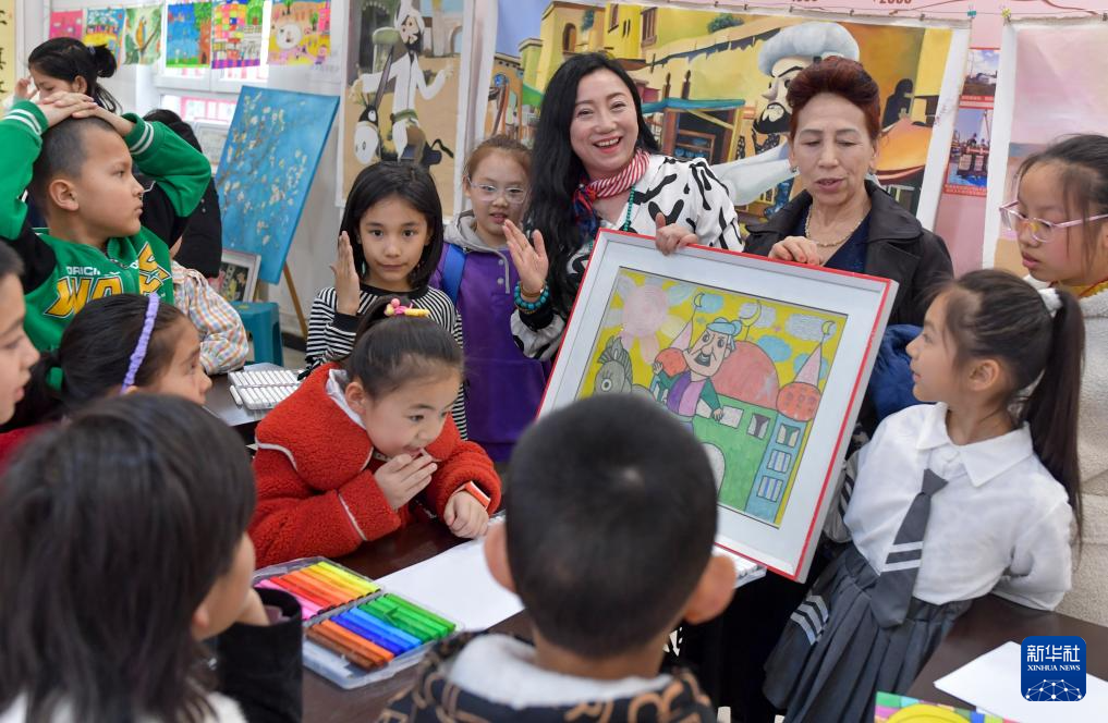 在乌鲁木齐市水磨沟区苇湖梁片区立井南社区,老师在公益美术课上为孩子们讲解绘画过程(3月22日摄)。