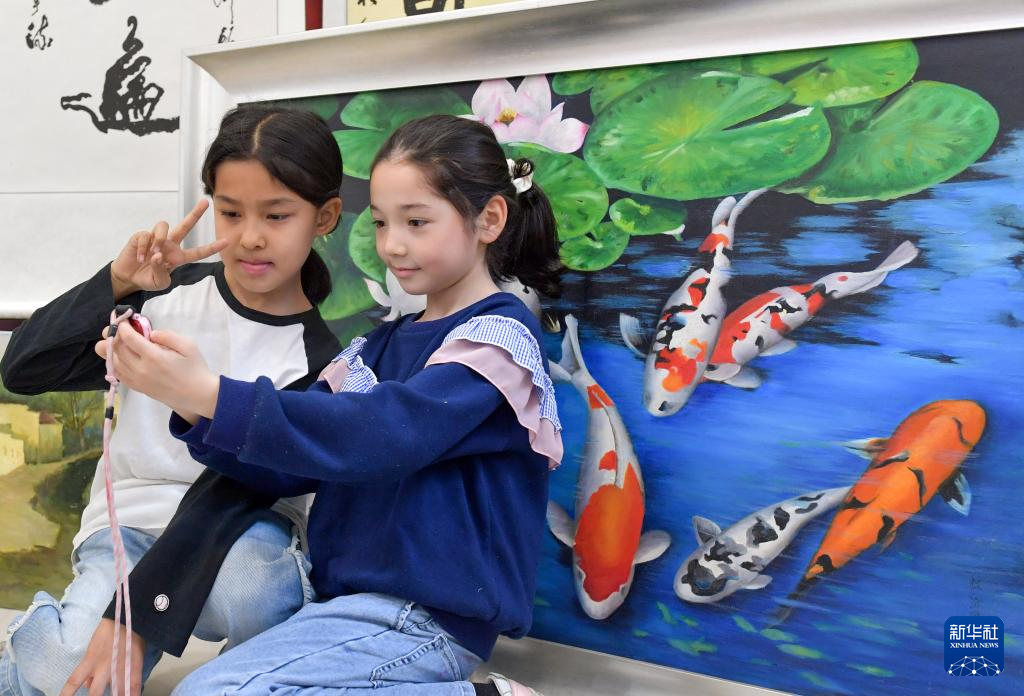 在乌鲁木齐市水磨沟区苇湖梁片区立井南社区的展厅中,小朋友在展出的美术作品前合影留念(3月22日摄)。