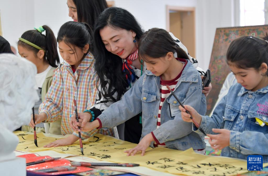 在乌鲁木齐市水磨沟区苇湖梁片区立井南社区,小朋友在公益书法课上跟随老师体验写书法(3月22日摄)。