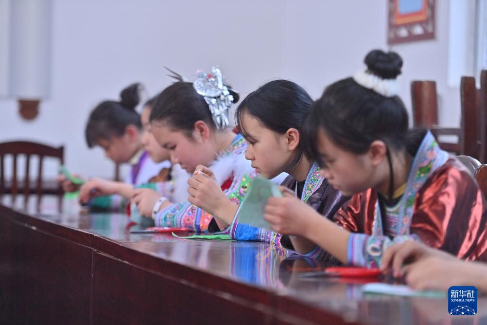3月25日,柳州市融水苗族自治县杆洞乡中心小学学生在刺绣。