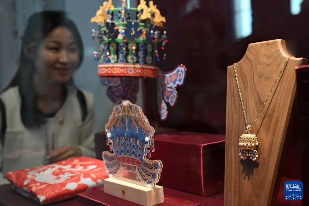 3月25日,观众在北京中国国家博物馆选购凤冠项链。