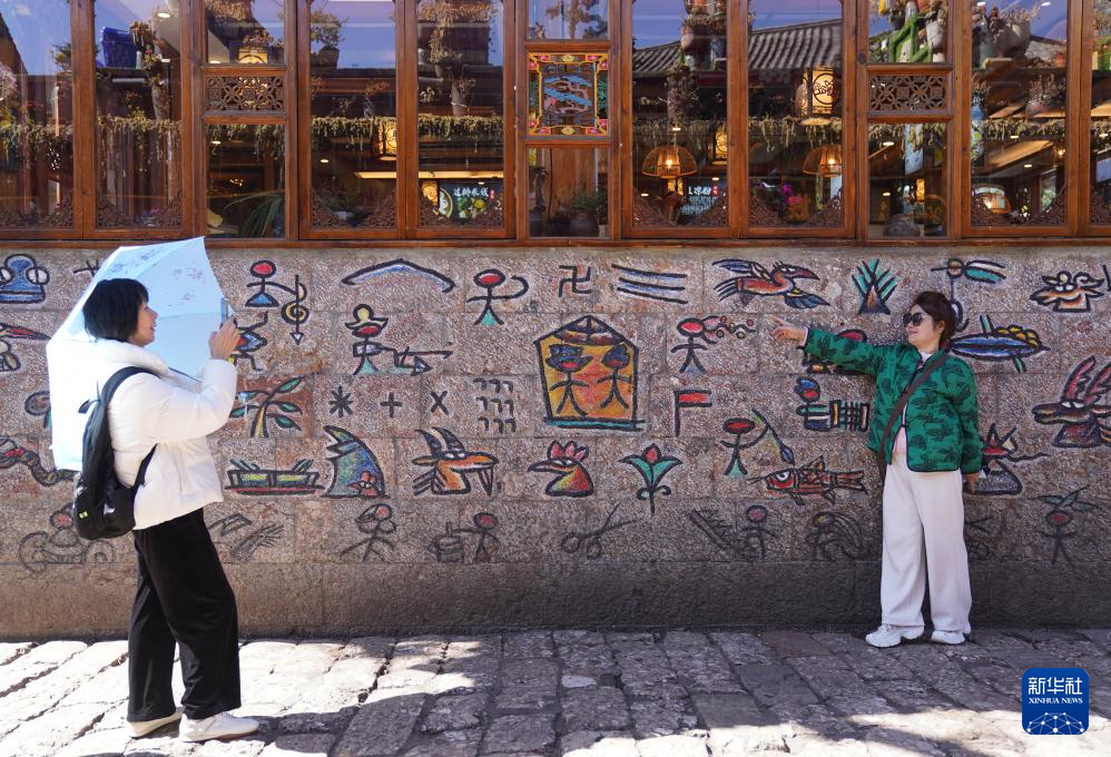 3月25日,游客在云南省丽江市丽江古城东巴文字墙前拍照。