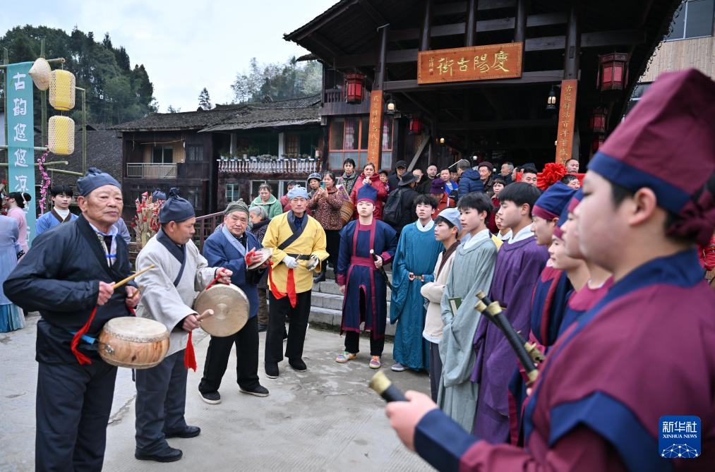 3月30日,人们身着传统服饰在宣恩县椒园镇庆阳古街前表演国家级非物质文化遗产“薅草锣鼓”。