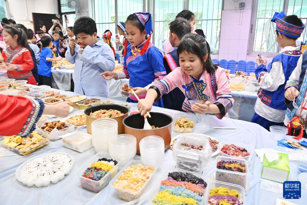 孩子们在广西南宁市民族大道东段小学品尝美食(3月27日摄)。新华社记者 周华 摄