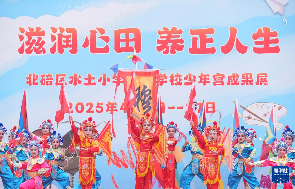 4月9日,在重庆市北碚区水土小学“滋润心田 养正人生”乡村学校少年宫成果展现场,孩子们在表演川剧《穆桂英》。