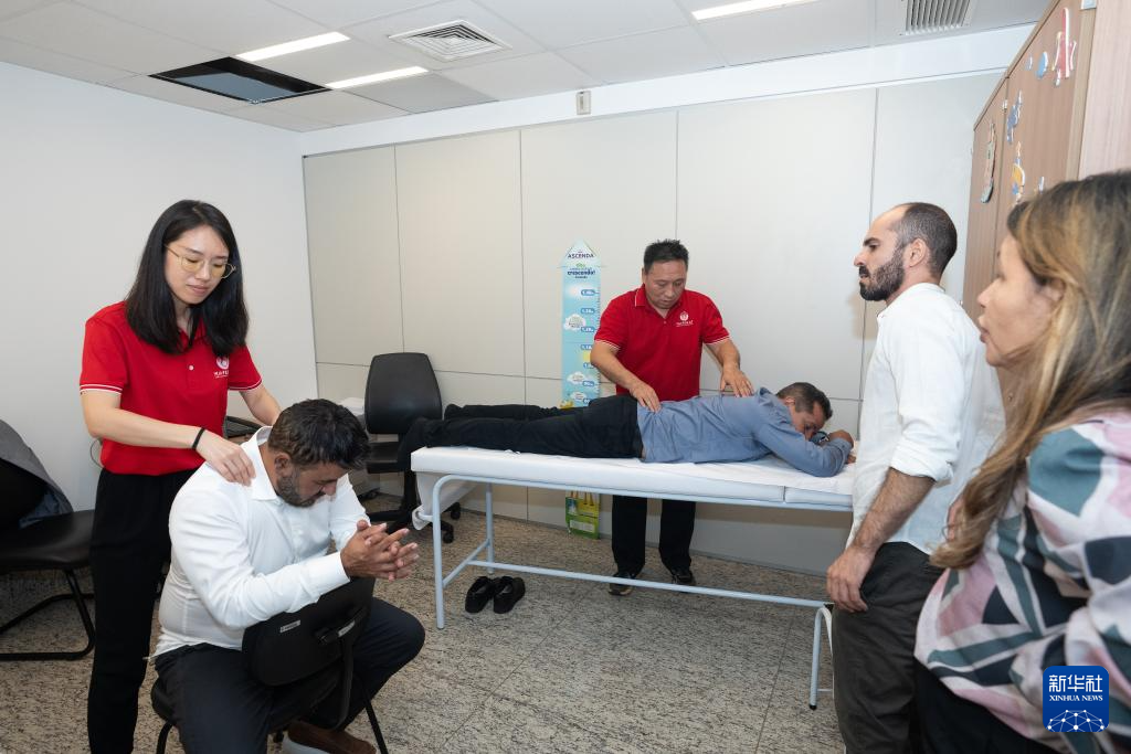 4月9日,在巴西戈亚斯州首府戈亚尼亚,中医孔子学院的老师为体验者进行推拿。