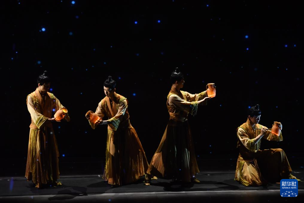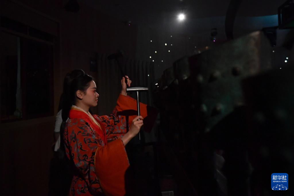 4月12日,演员在舞台剧《寻长沙》中演奏青铜铙。